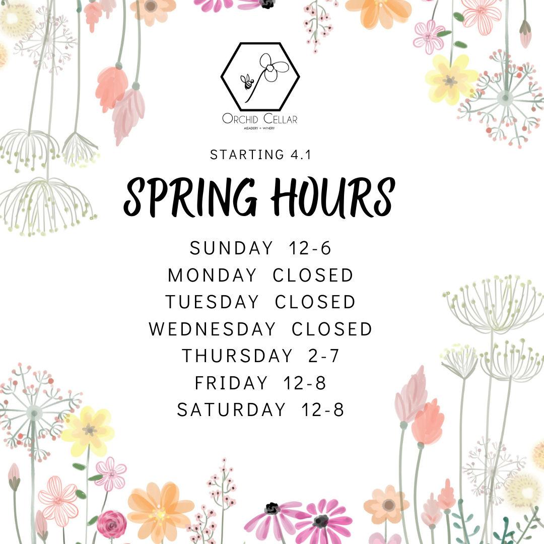 Spring Hours Begin Monday, April 1, 2024 12:00 AM 11:59 AM 00:00 11:59 Orchid Cellar Meadery and Winery 8546 Pete Wiles Rd Middletown, MD, 21769 United States (map) Google Calendar ICS Days are longer, and we’re open later!